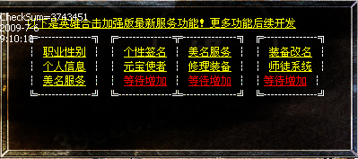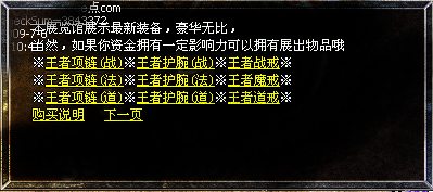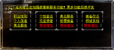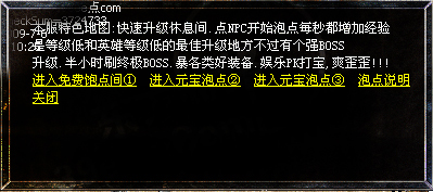 【攻略】盛大的装备爆率模式.卧龙名将穿戴的装备不需要灵符可以挖取. 【公告】新增白金会员套装,50级可以在领奖使者处领取! 【公告】装备合成请到封魔谷皇宫。 【特色】夺宝禁区从比奇大城的夺宝指挥官进入,一共分为八层,挑战完后可以得到丰厚的奖励! 【特色】战场从封魔神谷的战场NPC进入,消灭教主后获得宝盒,守护宝盒20分钟,成功后得到丰厚的奖励。 【特色】秒人阁从魔龙城进入,消灭秒人皇帝后获得丰厚的奖励。 【特色】魔宫在苍月岛安全区,在商铺里购买魔宫潜入卷进入,挑战成功后,获得大量经验。狂雷系列装备,天龙系列装备,王者系列装备在魔宫也有暴出,暴率高。 【攻略】中级装备狂雷,逆火,通云,卧龙山庄,魔宫,狂雷阁,雷炎洞,火龙洞等高等级地图高爆率 【攻略】中高级装备天龙套装,魔宫,天龙阁,雷炎洞,火龙洞等高等级地图爆 【攻略】元宝胜地的元宝猪必爆一个元宝,刷新快,装备回收可以换元宝,高级地图小怪有几率爆元宝! 【元宝】书店每小时刷一个“元宝精灵”必爆100元宝.本游戏元宝爆率很高,等级低的玩家可以打魔龙小怪或回收魔龙首饰换元宝, 【元宝】幻境10层90分钟刷一个“元宝精灵”必爆200元宝. 【加速】若发现使用非法加速,直接封号,100元解封一次!诬蔑他人捣乱者将被删号处理! 【沙巴克】第一抢沙奖励:王者四格、王者首饰 、1万元宝(道、法、战)三天守沙成功奖励:王者衣服、王者武器(道、法、战)七天守沙成功奖励:神器一把(道、法、战) 【攻略】元宝获取途径:元宝胜地,多功能服务员装备回收,小怪爆少量,元宝精灵,boss爆大量,赌场增值! 【版本】与盛大版同步更新!最新盛大王者套装!服务器使用双服务器负载,保证游戏的稳定.出售元宝维持服务器开支 【版本】道士英雄在开启精神力战术的情况下会对比自己等级低的怪进行近身攻击,你可以选择关闭此技能 【申明】本服开启挂机功能,下线时请关闭组队,取下勋章,否则后果自负。 【宗旨】大众化的游戏,公平,稳定,长期.〖骨灰〗级玩家的首选,不管你花钱不花钱都会玩的开心长期! 【练级】级好升,装备超级好爆(新技能,新装备,新地图等)超级好玩,极品多99%仿盛大英雄合击! 【公告】有任何问题和疑问请联系客服,我们将在第一时间为您解决!我们开的都是长期服,请大家放心! 【奖励】升级奖励不断,只要你肯努力不花钱也可以获得终极!王者套装.天龙圣剑.天龙圣衣.系统自动送出,请注意包裹空间! 【奖励】您升级到58级系统自动!奖励您、 魔血石(大)2枚(战、法、道) 【奖励】您升级到60级系统自动!奖励您、纯白玉鼠1枚(女性另外奖励“爱情玫瑰”一束)(战、法、道) 【奖励】您升级到63级系统自动!奖励您、吉祥玉鼠1枚(战、法、道) 【奖励】您升级到65级系统自动!奖励您、星王首饰全套、预言头盔、誓言腰带、传说魔靴、天之屠龙1把(战、法、道) 【奖励】您升级到68级系统自动!奖励您、凤天魔甲1件(战、法、道) 【奖励】您升级到70级系统自动!奖励您、开天1把+凤天魔甲1件(战、法、道) 【奖励】您升级到72级系统自动!奖励您、狂雷、逆火、通云首饰1套(战、法、道) 【奖励】您升级到75级系统自动!奖励您、狂雷四格、逆火四格、通云四格1套(战、法、道) 【奖励】您升级到78级系统自动!奖励您、狂雷级别武器衣服一套(战、法、道) 【奖励】您升级到80级系统自动!奖励您、天龙首饰1套(战、法、道) 【奖励】您升级到83级系统自动!奖励您、天龙四格1套(战、法、道) 【奖励】您升级到85级系统自动!奖励您、天龙圣衣1件(战、法、道) 【奖励】您升级到88级系统自动!奖励您、天龙圣剑1把(战、法、道) 【奖励】您升级到90级系统自动!奖励您、王者首饰1套(战、法、道) 【奖励】您升级到93级系统自动!奖励您、王者四格1套(战、法、道) 【奖励】您升级到96级系统自动!奖励您、王者战甲1件(战、法、道) 【奖励】您升级到100级系统自动!奖励您、王者武器1把(战、法、道) 【特色】夺宝禁区从比奇大城的夺宝指挥官进入,一共分为八层,挑战完后可以得到丰厚的奖励! 【特色】战场从封魔神谷的战场NPC进入,消灭教主后获得宝盒,守护宝盒20分钟,成功后得到丰厚的奖励。 【特色】秒人阁从魔龙城进入,消灭秒人皇帝后获得丰厚的奖励。 【特色】魔宫在苍月岛安全区,在商铺里购买魔宫潜入卷进入,挑战成功后,获得大量经验。狂雷系列装备,天龙系列装备,王者系列装备在魔宫也有暴出,暴率高。 【特色】独家豪华型别墅灵鼠窝系统 |